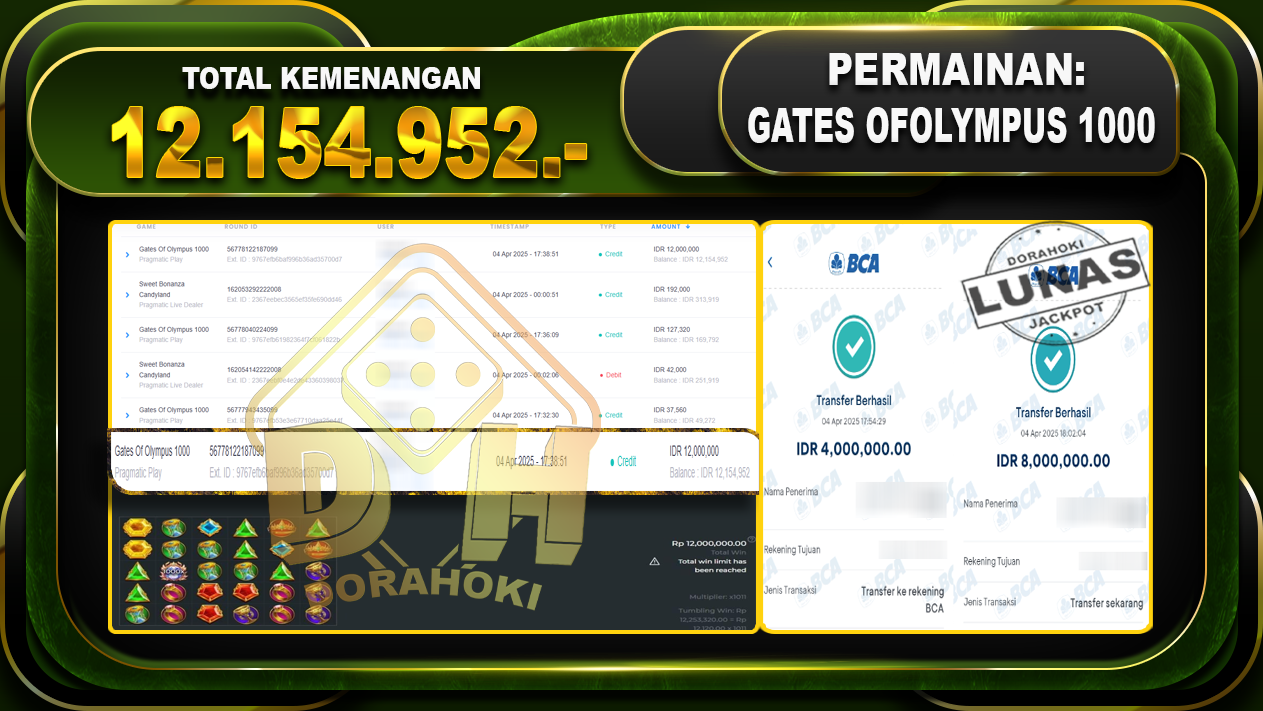 Bukti JP GATES OF OLYMPUS 1000 – ucapkan selamat kepada user id Decxxx atas kemenangan di GATES OF OLYMPUS 1000 dengan total kemenangan Rp.12.154.952,- . Yang pasti nya langsung LUNAS sesuai bukti ya bosku. Dorahoki nih bosku berapapun akan tetap kami bayar lunas ya bosku.