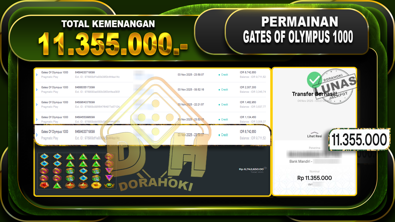 Bukti JP Gates Of Olympus 1000 – ucapkan selamat kepada user id broxxxx atas kemenangan di Gates Of Olympus 1000 dengan total kemenangan Rp.11.355.000,- Yang pasti nya langsung LUNAS sesuai bukti ya bosku. Dorahoki nih bosku berapapun akan tetap kami bayar lunas ya bosku