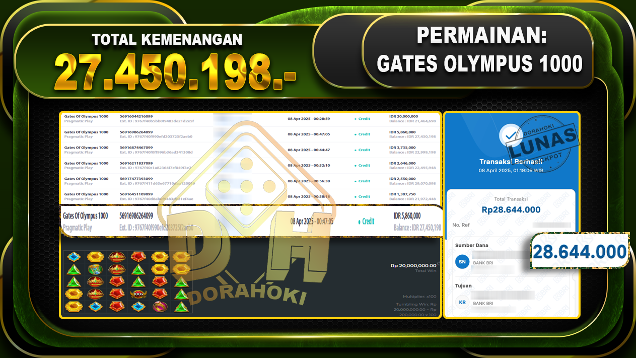 Bukti JP GATES OF OLYMPUS 1000 – ucapkan selamat kepada user id Khaxxx atas kemenangan di GATES OF OLYMPUS 1000 dengan total kemenangan Rp.27.450.198,- . Yang pasti nya langsung LUNAS sesuai bukti ya bosku. Dorahoki nih bosku berapapun akan tetap kami bayar lunas ya bosku.