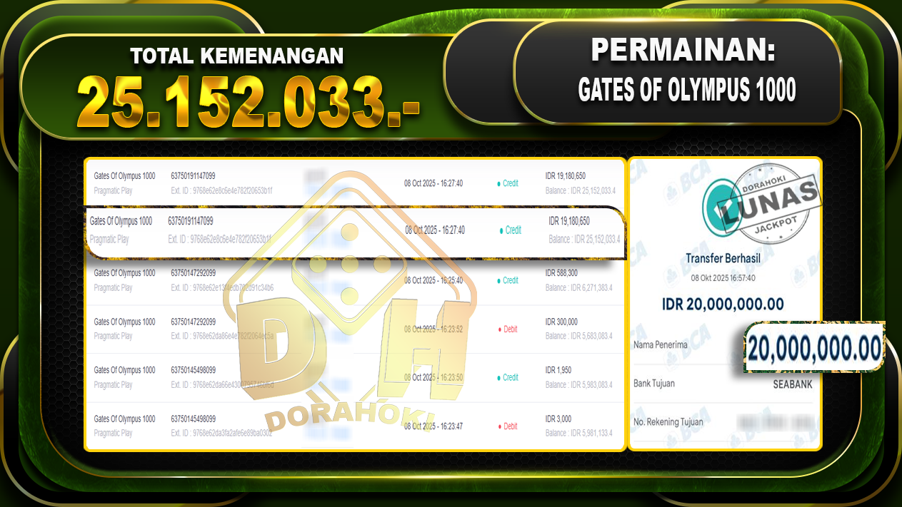 Bukti JP Gates Of Olympus 1000 – ucapkan selamat kepada user id grexxxxxx atas kemenangan di  Gates Of Olympus 1000 dengan total kemenangan Rp.25,152.033,- Yang pasti nya langsung LUNAS sesuai bukti ya bosku. Dorahoki nih bosku berapapun akan tetap kami bayar lunas ya bosku