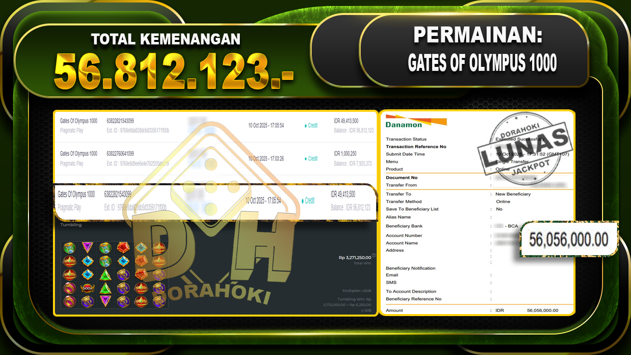 Bukti JP Gates Of Olympus 1000 – ucapkan selamat kepada user id varxxxx atas kemenangan di  Gates Of Olympus 1000 dengan total kemenangan Rp.56,812.123,- Yang pasti nya langsung LUNAS sesuai bukti ya bosku. Dorahoki nih bosku berapapun akan tetap kami bayar lunas ya bosku