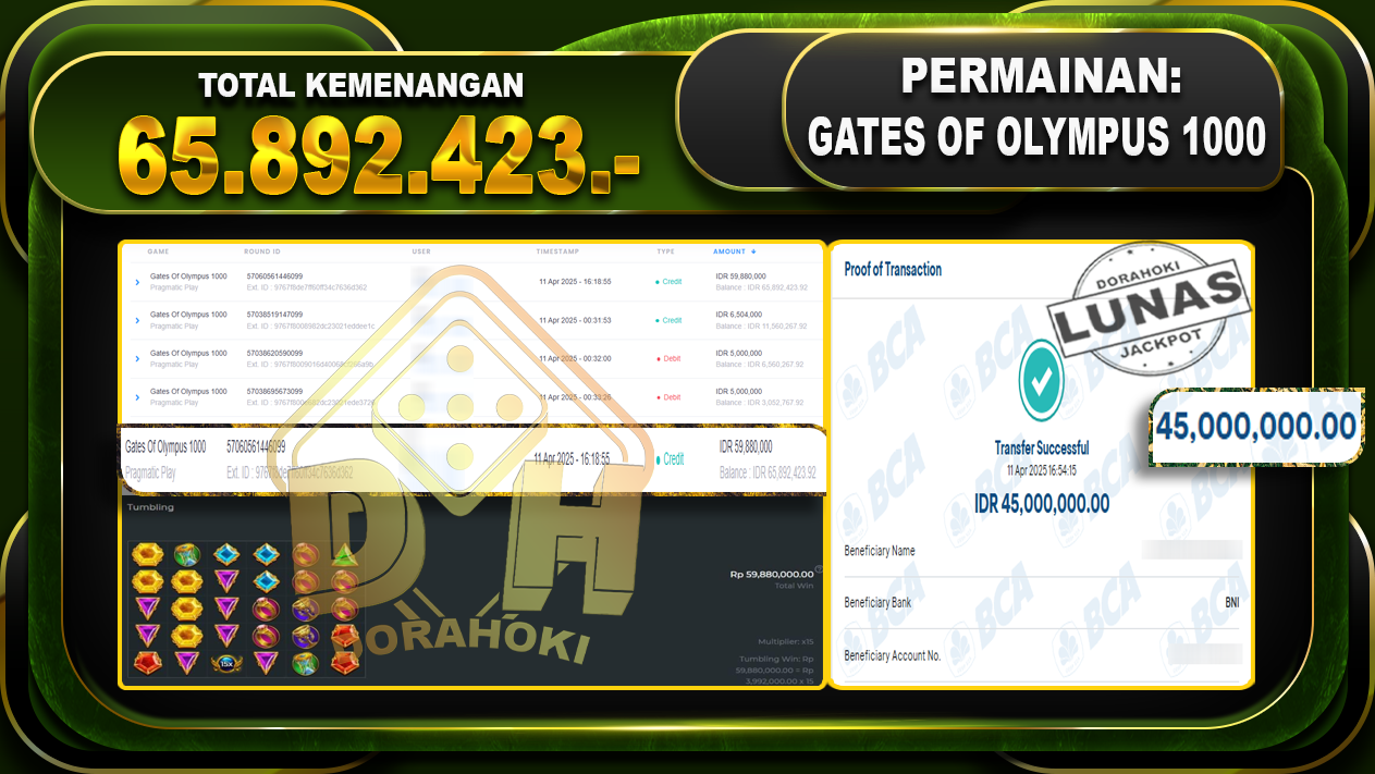 Bukti JP GATES OF OLYMPUS 1000 – ucapkan selamat kepada user id Jitxxx atas kemenangan di GATES OF OLYMPUS 1000 dengan total kemenangan Rp.65.892.423,- . Yang pasti nya langsung LUNAS sesuai bukti ya bosku. Dorahoki nih bosku berapapun akan tetap kami bayar lunas ya bosku.