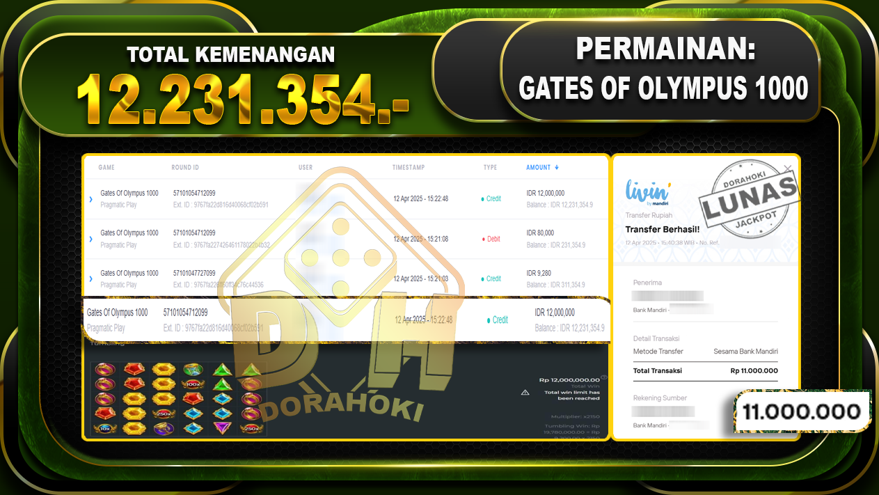 Bukti JP GATES OF OLYMPUS 1000 – ucapkan selamat kepada user id Gebxxx atas kemenangan di GATES OF OLYMPUS 1000 dengan total kemenangan Rp.12.231.354,- . Yang pasti nya langsung LUNAS sesuai bukti ya bosku. Dorahoki nih bosku berapapun akan tetap kami bayar lunas ya bosku.