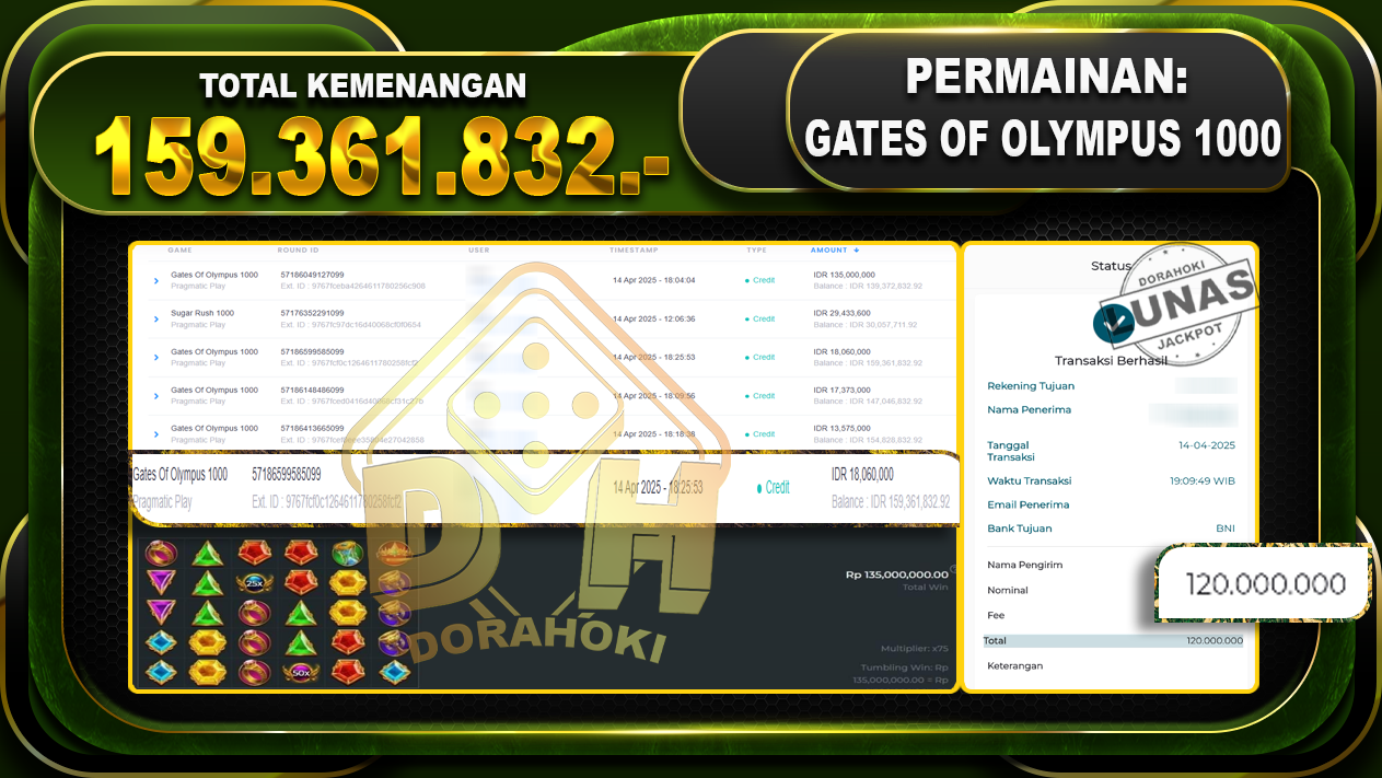 Bukti JP GATES OF OLYMPUS 1000 – ucapkan selamat kepada user id Jitxxx atas kemenangan di GATES OF OLYMPUS 1000 dengan total kemenangan Rp.159.361.832,- . Yang pasti nya langsung LUNAS sesuai bukti ya bosku. Dorahoki nih bosku berapapun akan tetap kami bayar lunas ya bosku.