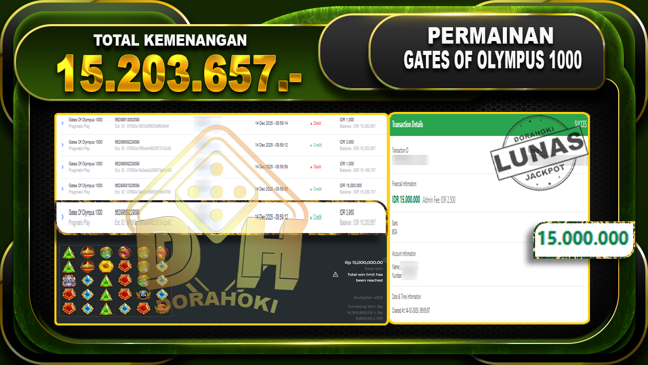 Bukti JP Gates Of Olympus 1000 – ucapkan selamat kepada user id yanxxxxx atas kemenangan di Gates Of Olympus 1000 dengan total kemenangan Rp.15.203.657,- Yang pasti nya langsung LUNAS sesuai bukti ya bosku. Dorahoki nih bosku berapapun akan tetap kami bayar lunas ya bosku