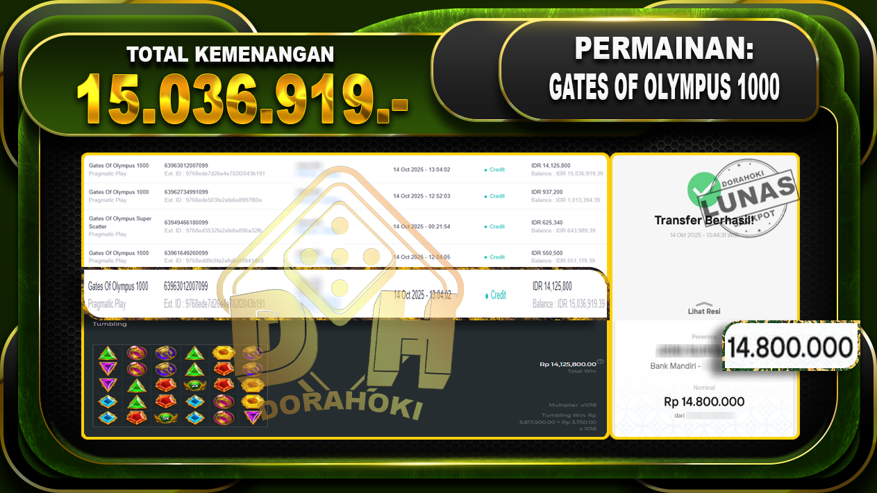 Bukti JP Gates Of Olympus 1000 – ucapkan selamat kepada user id chixxxxx atas kemenangan di Gates Of Olympus 1000 dengan total kemenangan Rp.15,036,919,- Yang pasti nya langsung LUNAS sesuai bukti ya bosku. Dorahoki nih bosku berapapun akan tetap kami bayar lunas ya bosku