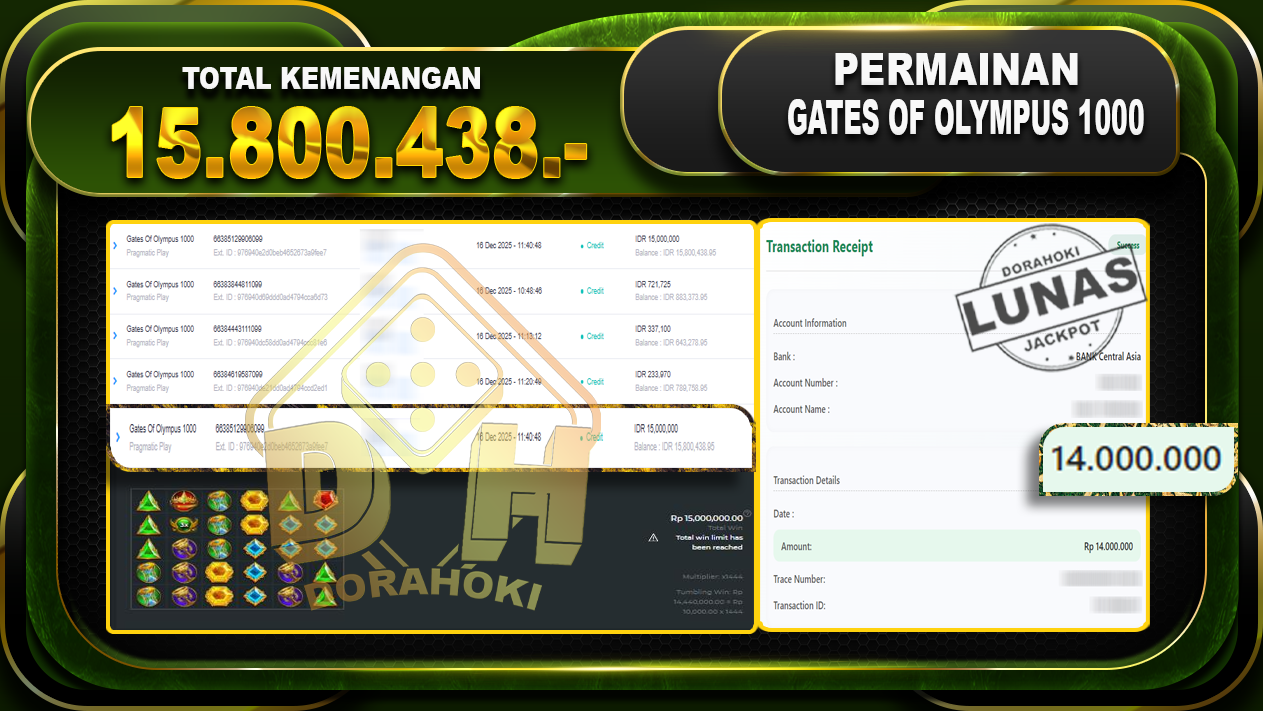 Bukti JP Gates Of Olympus 1000 – ucapkan selamat kepada user id jenxxxxx atas kemenangan di Gates Of Olympus 1000 dengan total kemenangan Rp.15.800.438,- Yang pasti nya langsung LUNAS sesuai bukti ya bosku. Dorahoki nih bosku berapapun akan tetap kami bayar lunas ya bosku