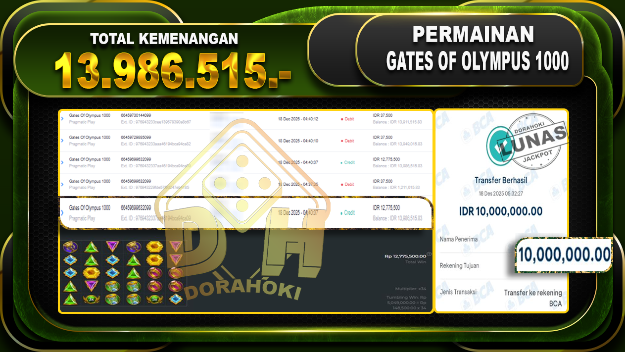 Bukti JP Gates Of Olympus 1000 – ucapkan selamat kepada user id duixxxxx atas kemenangan di Gates Of Olympus 1000 dengan total kemenangan Rp.13.986.515,- Yang pasti nya langsung LUNAS sesuai bukti ya bosku. Dorahoki nih bosku berapapun akan tetap kami bayar lunas ya bosku