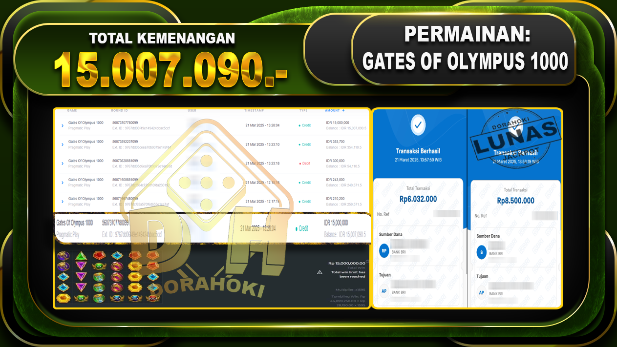Bukti JP GATES OF OLYMPUS 1000 – ucapkan selamat kepada user id Aprxxx atas kemenangan di GATES OF OLYMPUS 1000 dengan total kemenangan Rp.15.007.090,- . Yang pasti nya langsung LUNAS sesuai bukti ya bosku. Dorahoki nih bosku berapapun akan tetap kami bayar lunas ya bosku.