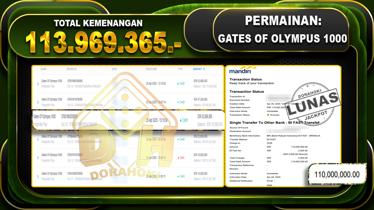 Bukti JP GATES OF OLYMPUS 1000 – ucapkan selamat kepada user id Prixxx atas kemenangan di GATES OF OLYMPUS 1000 dengan total kemenangan Rp.113.969.365,- . Yang pasti nya langsung LUNAS sesuai bukti ya bosku. Dorahoki nih bosku berapapun akan tetap kami bayar lunas ya bosku.