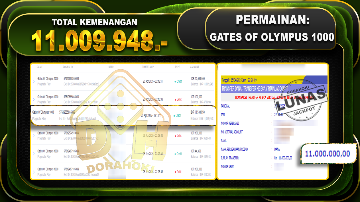Bukti JP GATES OF OLYMPUS 1000 – ucapkan selamat kepada user id Warxxx atas kemenangan di GATES OF OLYMPUS 1000 dengan total kemenangan Rp.11.009.948,- . Yang pasti nya langsung LUNAS sesuai bukti ya bosku. Dorahoki nih bosku berapapun akan tetap kami bayar lunas ya bosku.
