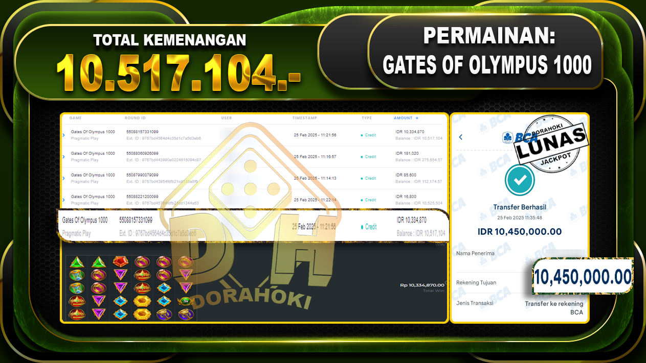 Bukti JP GATES OF OLYMPUS 1000 – ucapkan selamat kepada user id utayxxx atas kemenangan di GATES OF OLYMPUS 1000 dengan total kemenangan Rp.10.517.104,- . Yang pasti nya langsung LUNAS sesuai bukti ya bosku. Dorahoki nih bosku berapapun akan tetap kami bayar lunas ya bosku.