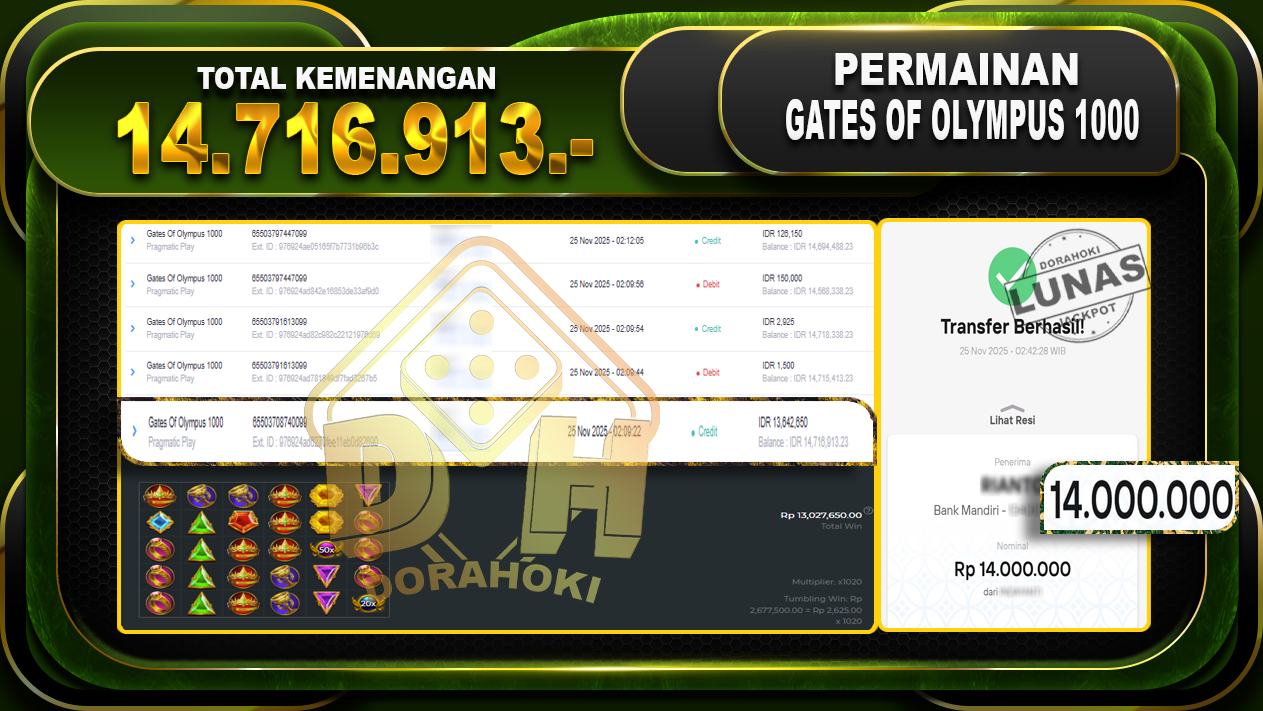 Bukti JP Gates Of Olympus 1000 – ucapkan selamat kepada user id lasxxxx atas kemenangan di  Gates Of Olympus 1000 dengan total kemenangan Rp.14.716.913,- Yang pasti nya langsung LUNAS sesuai bukti ya bosku. Dorahoki nih bosku berapapun akan tetap kami bayar lunas ya bosku