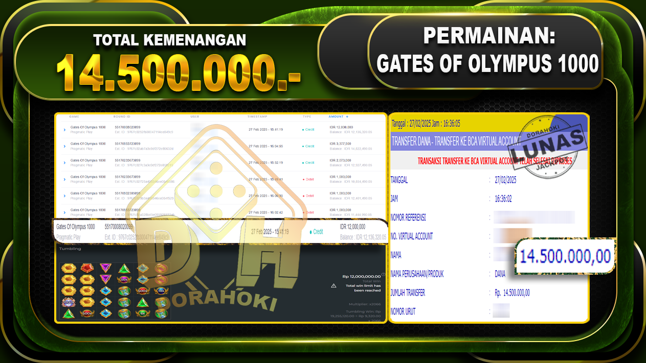 Bukti JP GATES OF OLYMPUS 1000 – ucapkan selamat kepada user id 241xxx atas kemenangan di GATES OF OLYMPUS 1000 dengan total kemenangan Rp.14.500.000,- . Yang pasti nya langsung LUNAS sesuai bukti ya bosku. Dorahoki nih bosku berapapun akan tetap kami bayar lunas ya bosku.