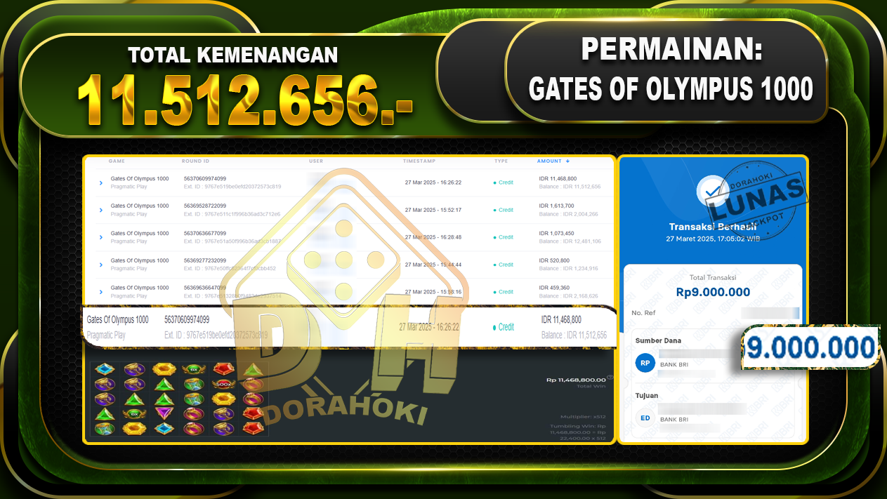 Bukti JP GATES OF OLYMPUS 1000 – ucapkan selamat kepada user id Mimxxx atas kemenangan di GATES OF OLYMPUS 1000 dengan total kemenangan Rp.11.512.656,- . Yang pasti nya langsung LUNAS sesuai bukti ya bosku. Dorahoki nih bosku berapapun akan tetap kami bayar lunas ya bosku.