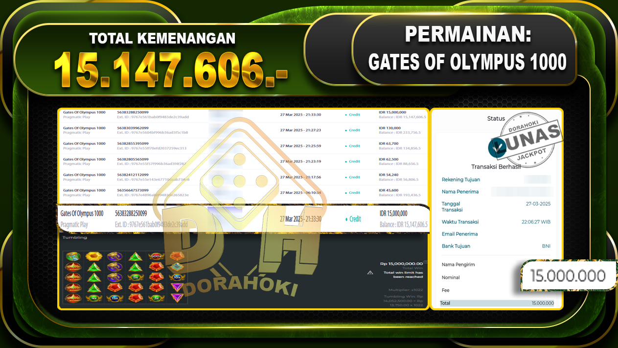 Bukti JP GATES OF OLYMPUS 1000 – ucapkan selamat kepada user id Manxxx atas kemenangan di GATES OF OLYMPUS 1000 dengan total kemenangan Rp.15.147.606,- . Yang pasti nya langsung LUNAS sesuai bukti ya bosku. Dorahoki nih bosku berapapun akan tetap kami bayar lunas ya bosku.