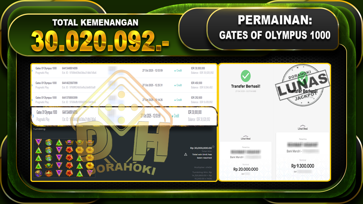 Bukti JP Gates Of Olympus 1000 – ucapkan selamat kepada user id matrxxxxxx atas kemenangan di Gates Of Olympus 1000 dengan total kemenangan Rp.30,020,092 ,- Yang pasti nya langsung LUNAS sesuai bukti ya bosku. Dorahoki nih bosku berapapun akan tetap kami bayar lunas ya bosku
