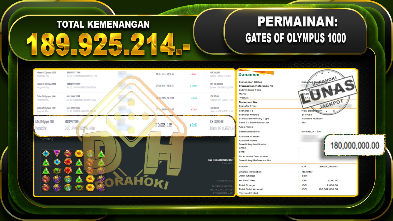 Bukti JP Gates Of Olympus 1000 – ucapkan selamat kepada user id marxxxxxx atas kemenangan di Gates Of Olympus 1000 dengan total kemenangan Rp.189,925,214,- Yang pasti nya langsung LUNAS sesuai bukti ya bosku. Dorahoki nih bosku berapapun akan tetap kami bayar lunas ya bosku