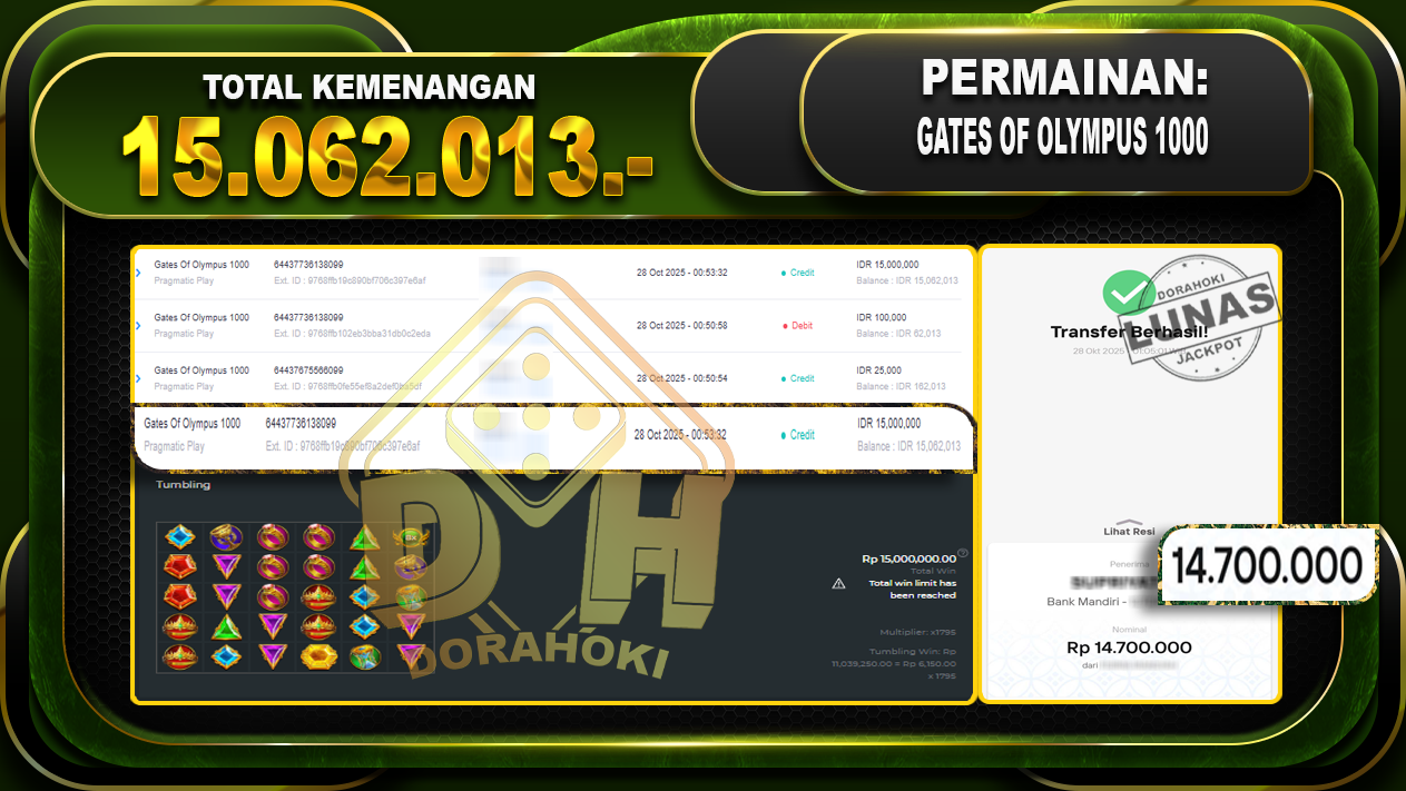 Bukti JP Gates Of Olympus 1000 – ucapkan selamat kepada user id surxxxxx atas kemenangan di Gates Of Olympus 1000 dengan total kemenangan Rp.15,062,013,- Yang pasti nya langsung LUNAS sesuai bukti ya bosku. Dorahoki nih bosku berapapun akan tetap kami bayar lunas ya bosku