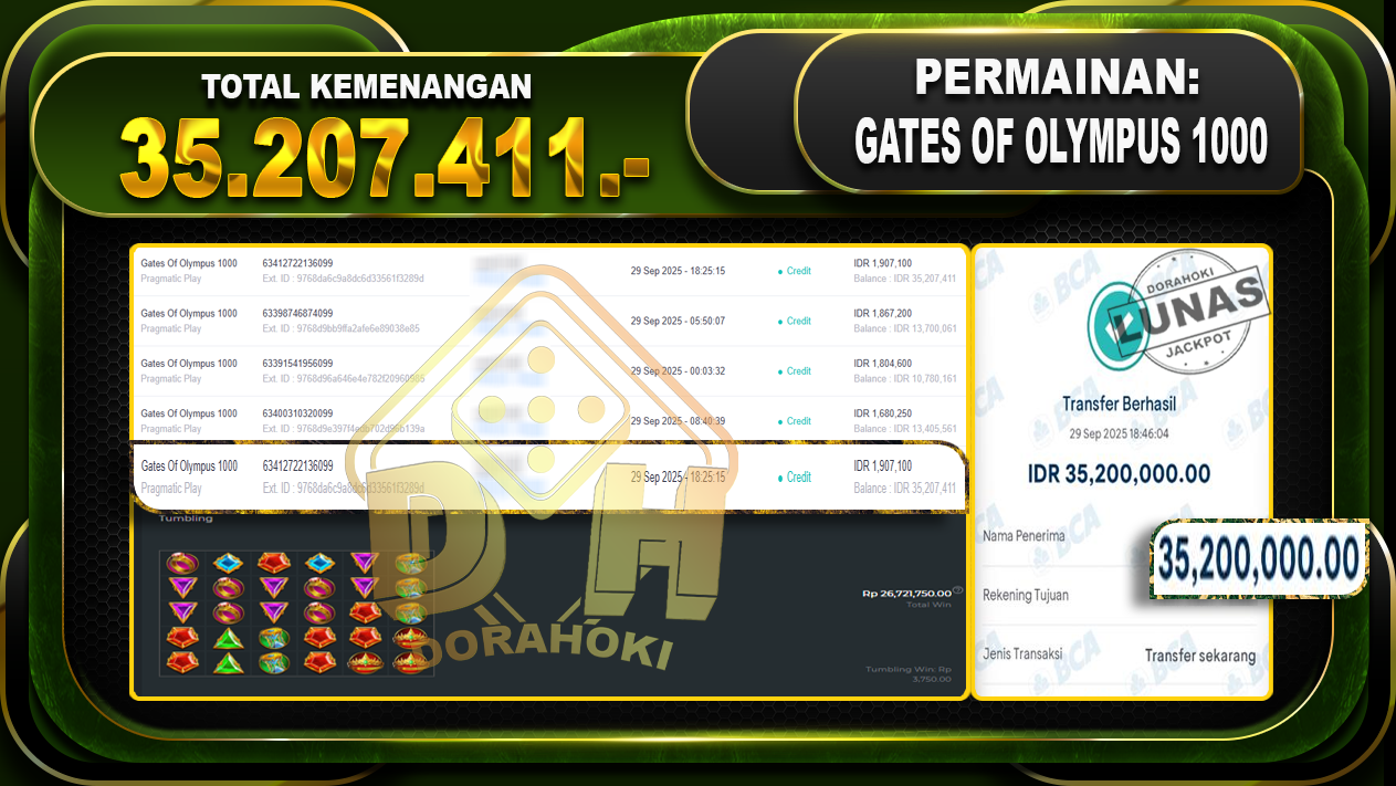 Bukti JP Gates Of Olympus 1000 – ucapkan selamat kepada user id varexxxxx atas kemenangan di Gates Of Olympus 1000 dengan total kemenangan Rp.35,207.411,- Yang pasti nya langsung LUNAS sesuai bukti ya bosku. Dorahoki nih bosku berapapun akan tetap kami bayar lunas ya bosku
