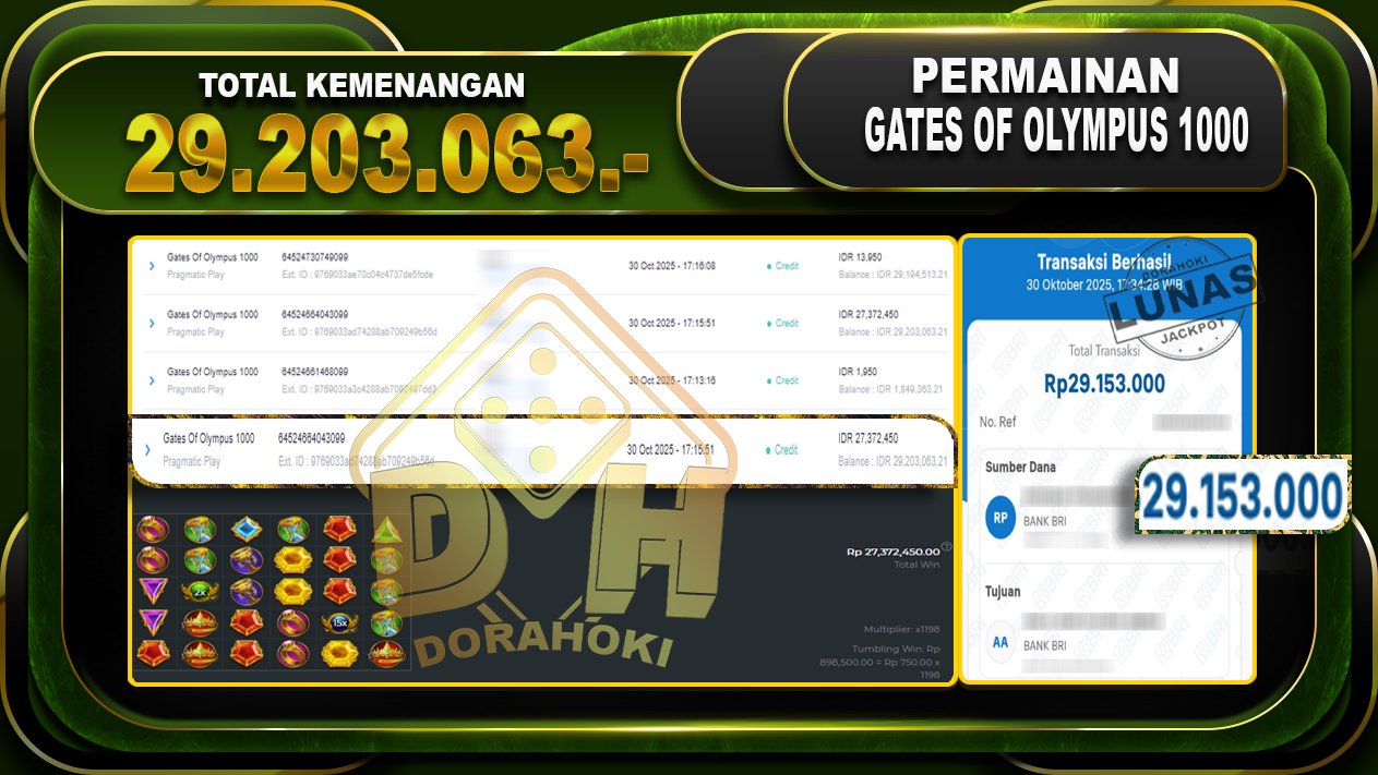 Bukti JP Gates Of Olympus 1000 – ucapkan selamat kepada user id jayxxxx atas kemenangan di Gates Of Olympus 1000 dengan total kemenangan Rp.29,203,000,- Yang pasti nya langsung LUNAS sesuai bukti ya bosku. Dorahoki nih bosku berapapun akan tetap kami bayar lunas ya bosku