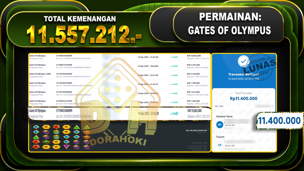 Bukti JP GATES OF OLYMPUS – ucapkan selamat kepada user id Khaxxx atas kemenangan di GATES OF OLYMPUS 1000 dengan total kemenangan Rp.11.557.212,- . Yang pasti nya langsung LUNAS sesuai bukti ya bosku. Dorahoki nih bosku berapapun akan tetap kami bayar lunas ya bosku.