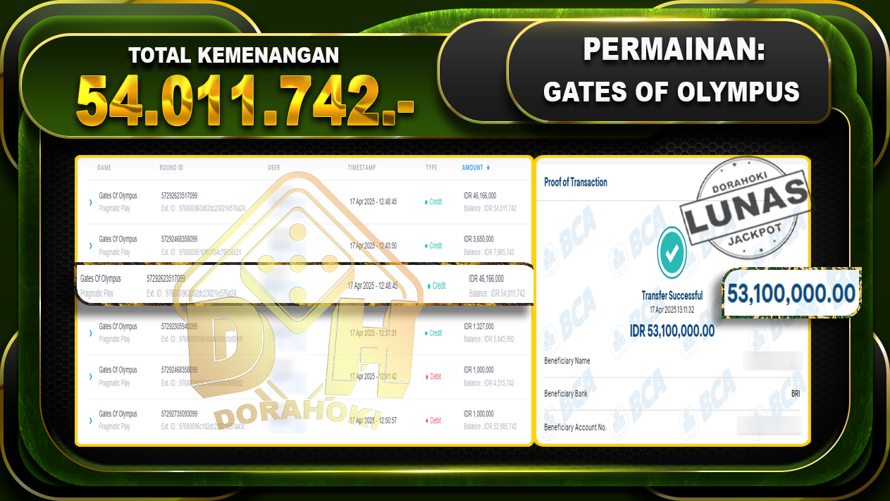 Bukti JP GATES OF OLYMPUS – ucapkan selamat kepada user id Yahxxx atas kemenangan di GATES OF OLYMPUS 1000 dengan total kemenangan Rp.54.011.742,- . Yang pasti nya langsung LUNAS sesuai bukti ya bosku. Dorahoki nih bosku berapapun akan tetap kami bayar lunas ya bosku.