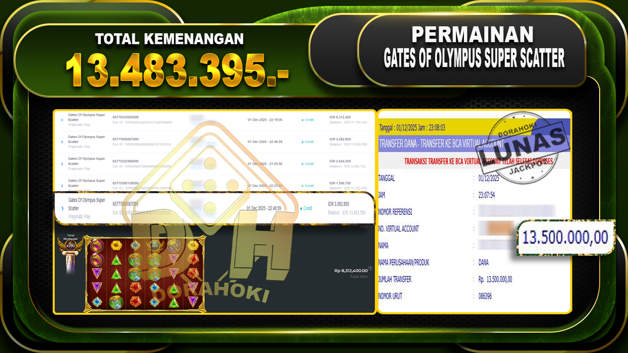 Bukti JP Gates Of Olympus Super Scatter – ucapkan selamat kepada user id hadxxxx atas kemenangan di Gates Of Olympus Super Scatter dengan total kemenangan Rp.10.941.466,- Yang pasti nya langsung LUNAS sesuai bukti ya bosku. Dorahoki nih bosku berapapun akan tetap kami bayar lunas ya bosku