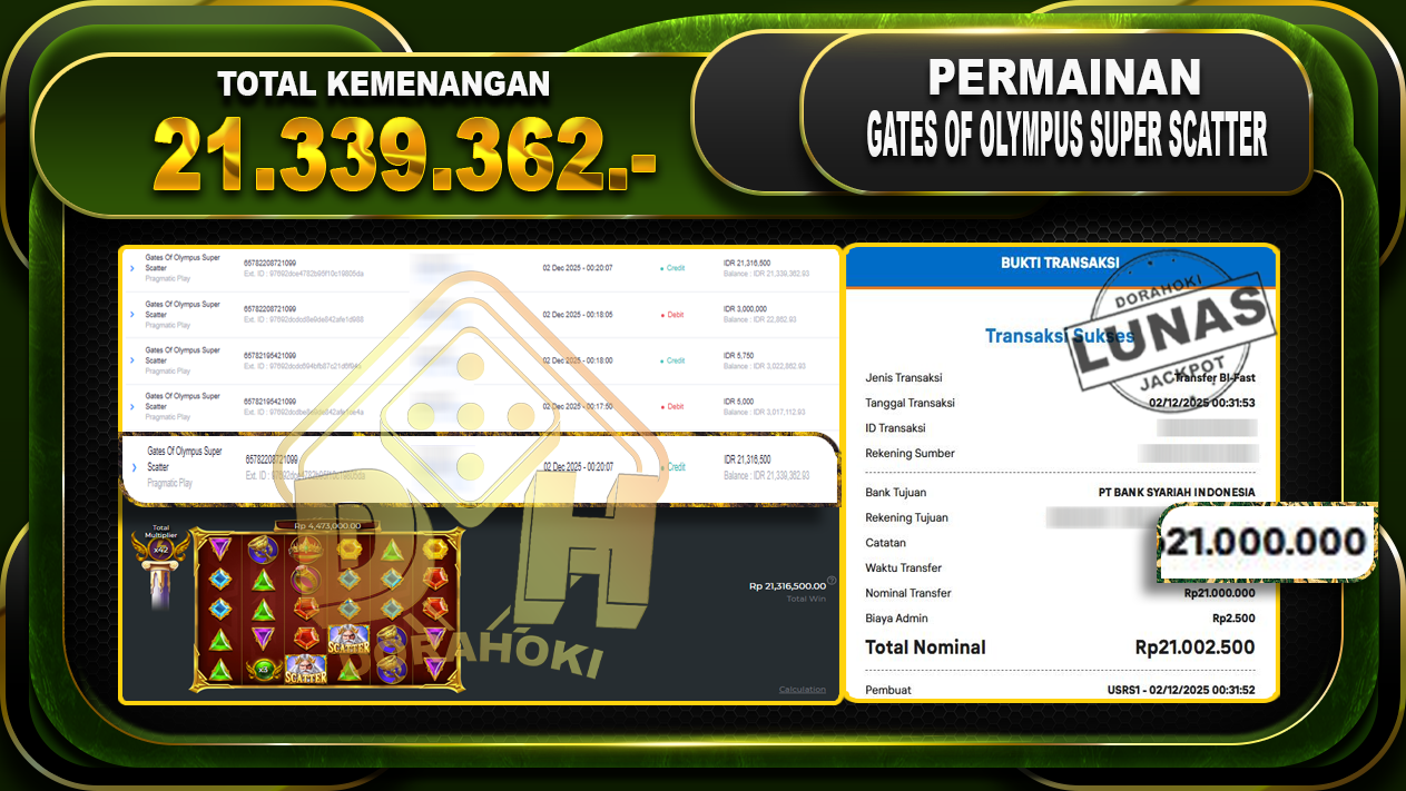 Bukti JP Gates Of Olympus Super Scatter – ucapkan selamat kepada user id kusxxxxx atas kemenangan di Gates Of Olympus Super Scatter dengan total kemenangan Rp.21.339.362,- Yang pasti nya langsung LUNAS sesuai bukti ya bosku. Dorahoki nih bosku berapapun akan tetap kami bayar lunas ya bosku
