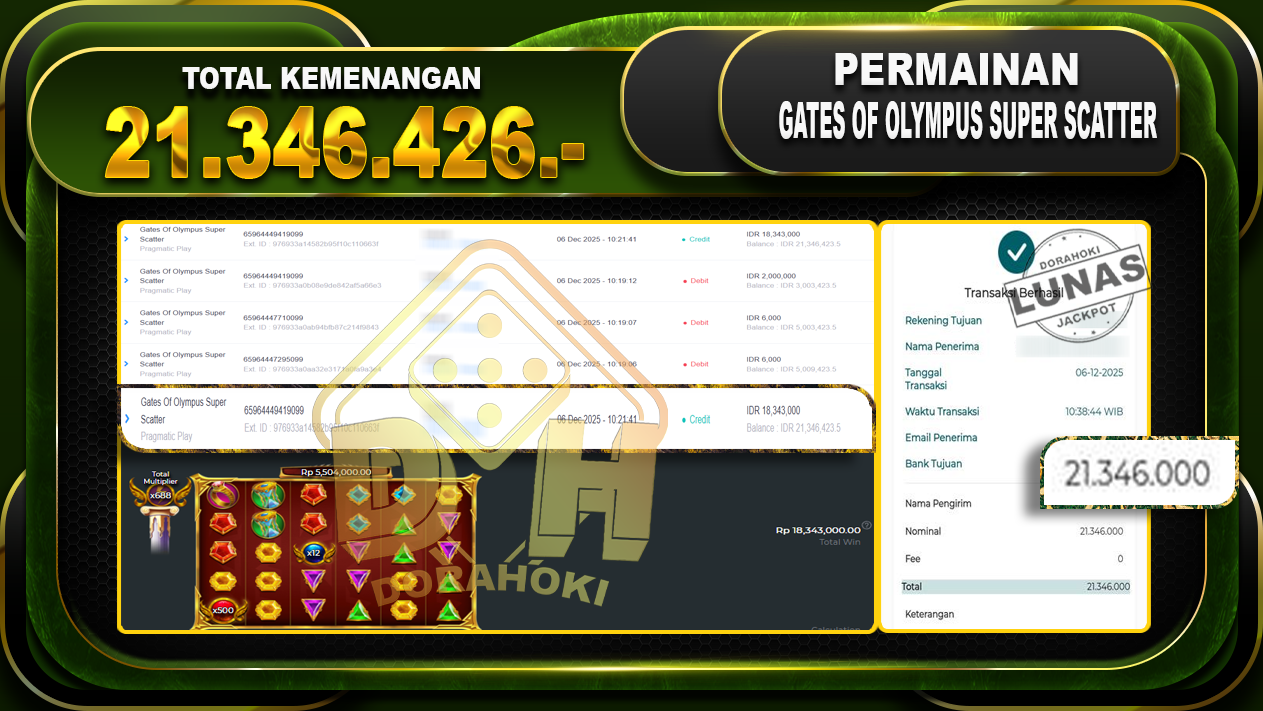 Bukti JP Gates Of Olympus Super Scatter – ucapkan selamat kepada user id hokxxxxx atas kemenangan di Gates Of Olympus Super Scatter dengan total kemenangan Rp.21.346.426,- Yang pasti nya langsung LUNAS sesuai bukti ya bosku. Dorahoki nih bosku berapapun akan tetap kami bayar lunas ya bosku