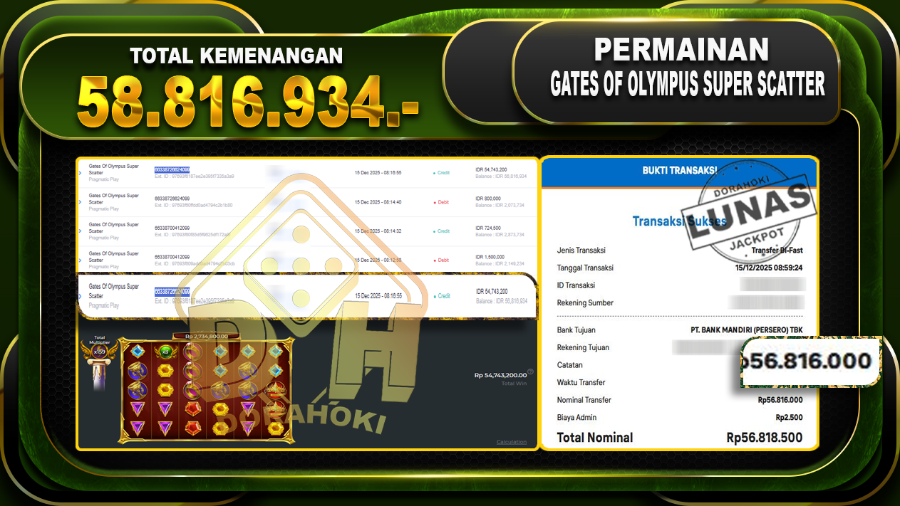 Bukti JP Gates Of Olympus Super Scatter – ucapkan selamat kepada user id janxxx atas kemenangan di Gates Of Olympus Super Scatter dengan total kemenangan Rp.58.816.934,- Yang pasti nya langsung LUNAS sesuai bukti ya bosku. Dorahoki nih bosku berapapun akan tetap kami bayar lunas ya bosku
