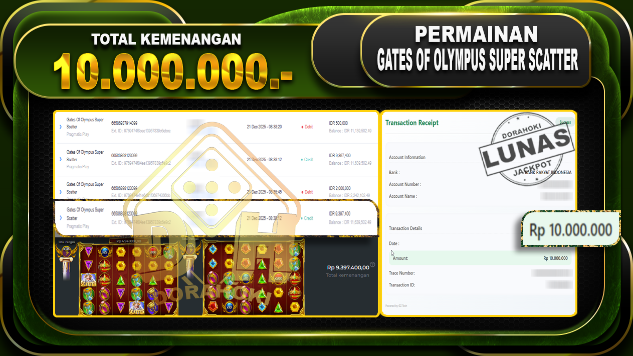 Bukti JP Gates Of Olympus Super Scatter – ucapkan selamat kepada user id anixxx atas kemenangan di Gates Of Olympus Super Scatter dengan total kemenangan Rp.10.000.000,- Yang pasti nya langsung LUNAS sesuai bukti ya bosku. Dorahoki nih bosku berapapun akan tetap kami bayar lunas ya bosku