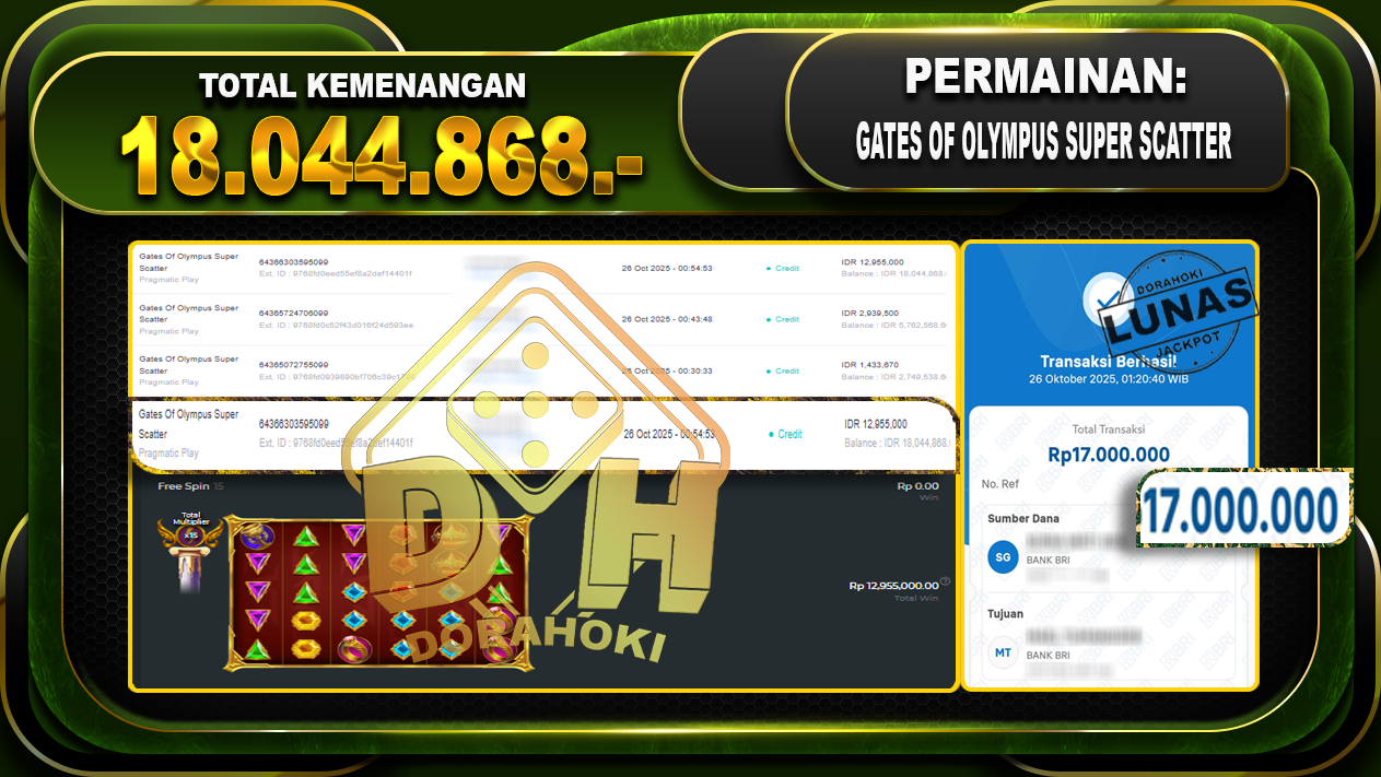 Bukti JP Gates Of Olympus Super Scatter – ucapkan selamat kepada user id kpnxxxxxx atas kemenangan di Gates Of Olympus Super Scatter dengan total kemenangan Rp.18.044.868,- Yang pasti nya langsung LUNAS sesuai bukti ya bosku. Dorahoki nih bosku berapapun akan tetap kami bayar lunas ya bosku