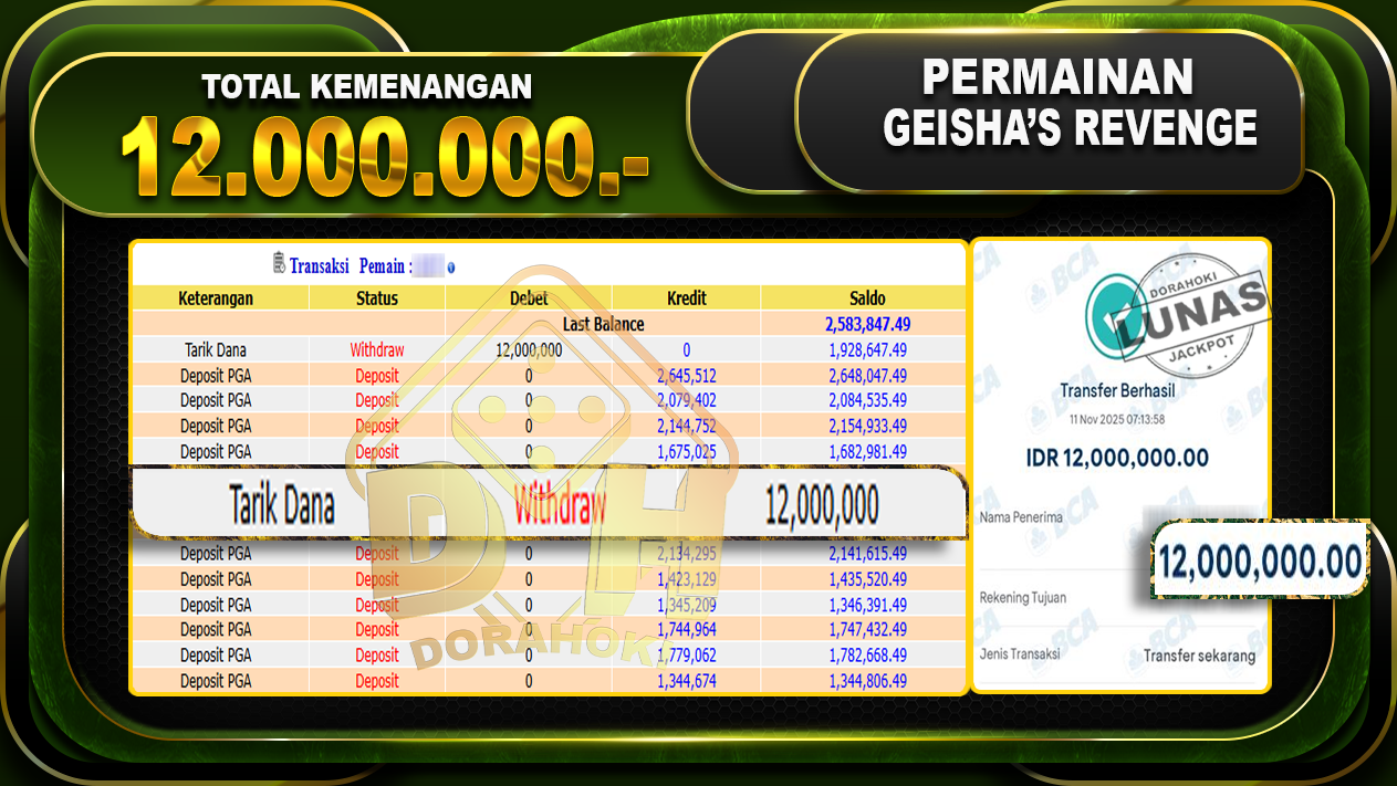 Bukti JP Geisha’s Revenge – Yang kami berikan ini sah dan real tanpa di rekayasa bosku dan hanya bertujuan untuk meningkatkan kepercayaan member kami dan memberikan kenyamanan saat bermain jadi bosku tidak perlu khawatir MENANG BERAPAPUN PASTI KAMI BAYAR LUNAS!!