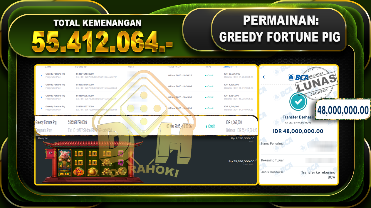 Bukti JP Greedy Fortune Pig- ucapkan selamat kepada user id Marxxx atas kemenangan di Greedy Fortune Pig dengan total kemenangan Rp.55.412.064,- . Yang pasti nya langsung LUNAS sesuai bukti ya bosku. Dorahoki nih bosku berapapun akan tetap kami bayar lunas ya bosku.