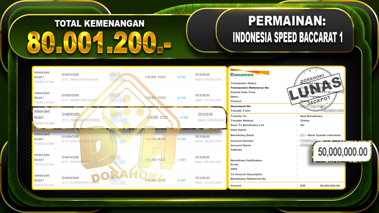 Bukti JP Indonesia Speed Baccarat 1 – ucapkan selamat kepada user id praxxxxxxx atas kemenangan di Indonesia Speed Baccarat 1 dengan total kemenangan Rp.80.001.200,- Yang pasti nya langsung LUNAS sesuai bukti ya bosku. Dorahoki nih bosku berapapun akan tetap kami bayar lunas ya bosku