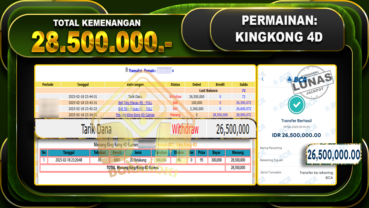 Bukti JP KING KONG 4D GAMES- ucapkan selamat kepada user id alex12xxx atas kemenangan di  KING KONG 4D GAMES dengan total kemenangan Rp.28.500.000,- . Yang pasti nya langsung LUNAS sesuai bukti ya bosku. Dorahoki nih bosku berapapun akan tetap kami bayar lunas ya bosku.