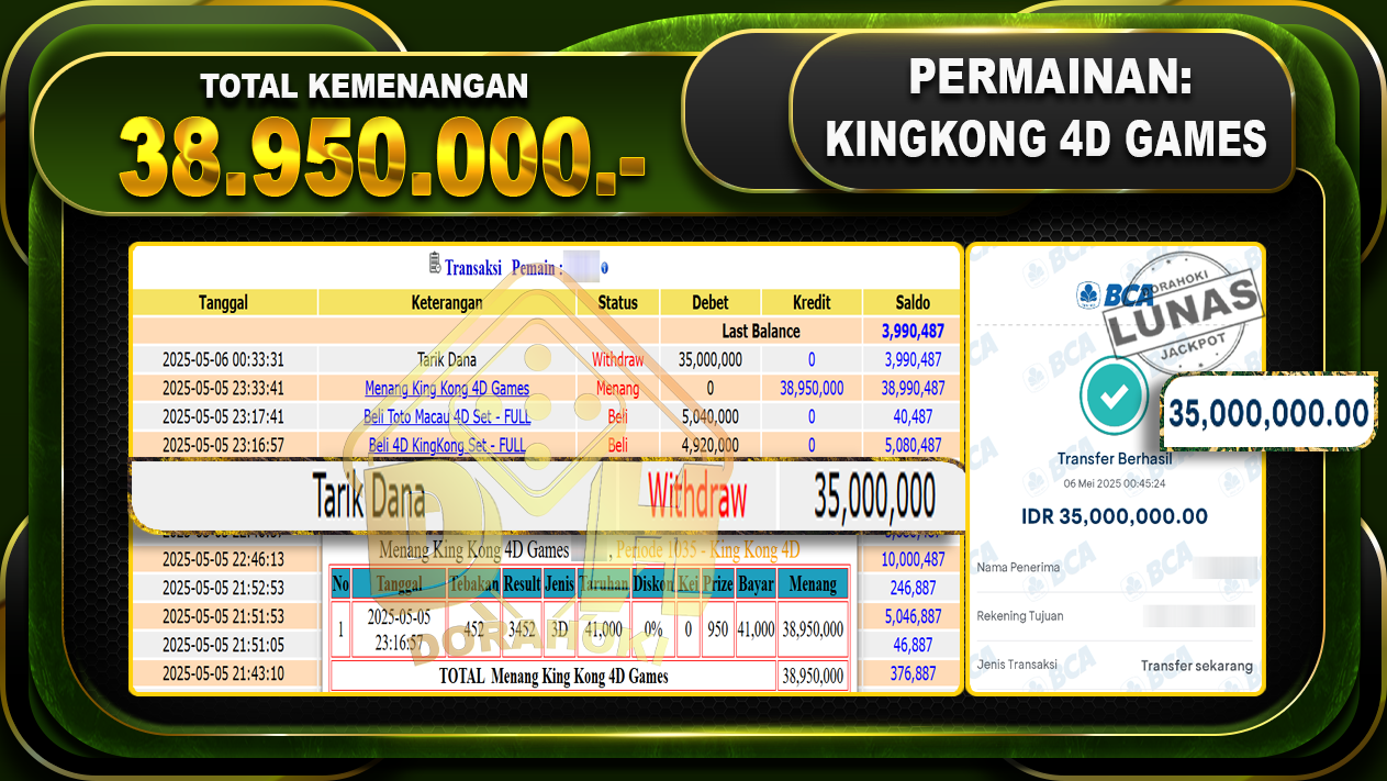 Bukti JP KingKong 4D – ucapkan selamat kepada user id Busxxx atas kemenangan di KingKong 4D dengan total kemenangan Rp.38.950.000,- . Yang pasti nya langsung LUNAS sesuai bukti ya bosku. Dorahoki nih bosku berapapun akan tetap kami bayar lunas ya bosku.