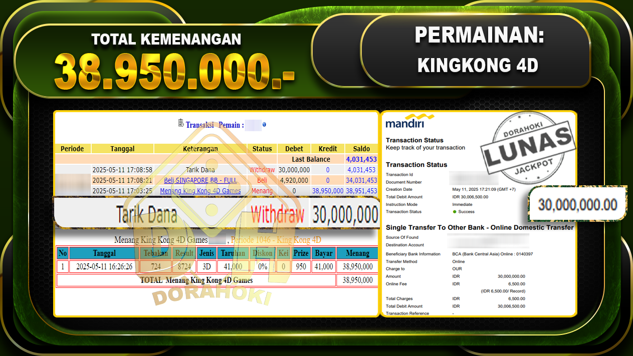 Bukti JP KingKong 4D – ucapkan selamat kepada user id Busxxx atas kemenangan di KingKong 4D dengan total kemenangan Rp.38.950.000,- . Yang pasti nya langsung LUNAS sesuai bukti ya bosku. Dorahoki nih bosku berapapun akan tetap kami bayar lunas ya bosku.