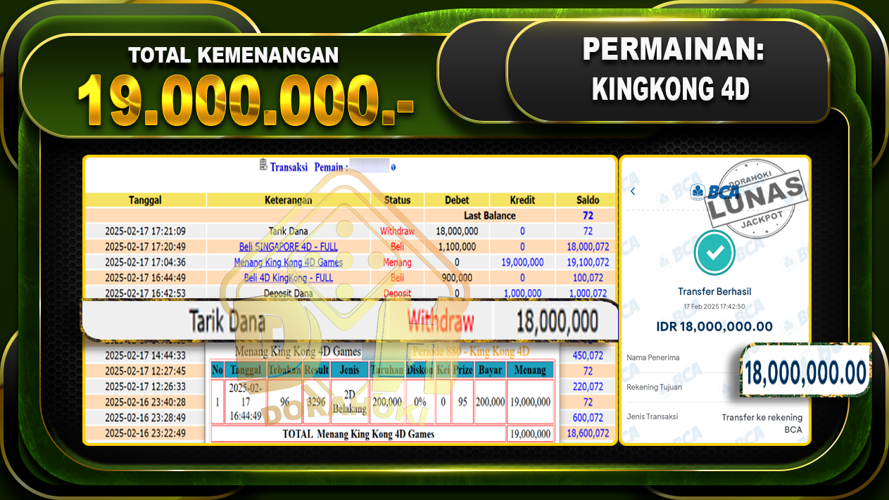Bukti JP KingKong 4D – ucapkan selamat kepada user id ALEX12xxx atas kemenangan di KingKong 4D dengan total kemenangan Rp.19.000.000,- . Yang pasti nya langsung LUNAS sesuai bukti ya bosku. Dorahoki nih bosku berapapun akan tetap kami bayar lunas ya bosku.