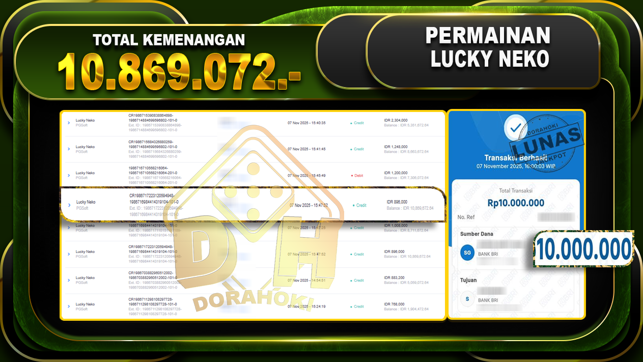 Bukti JP Lucky Neko – ucapkan selamat kepada user id popxxxx atas kemenangan di Lucky Neko dengan total kemenangan Rp.10.869.072,- Yang pasti nya langsung LUNAS sesuai bukti ya bosku. Dorahoki nih bosku berapapun akan tetap kami bayar lunas ya bosku.