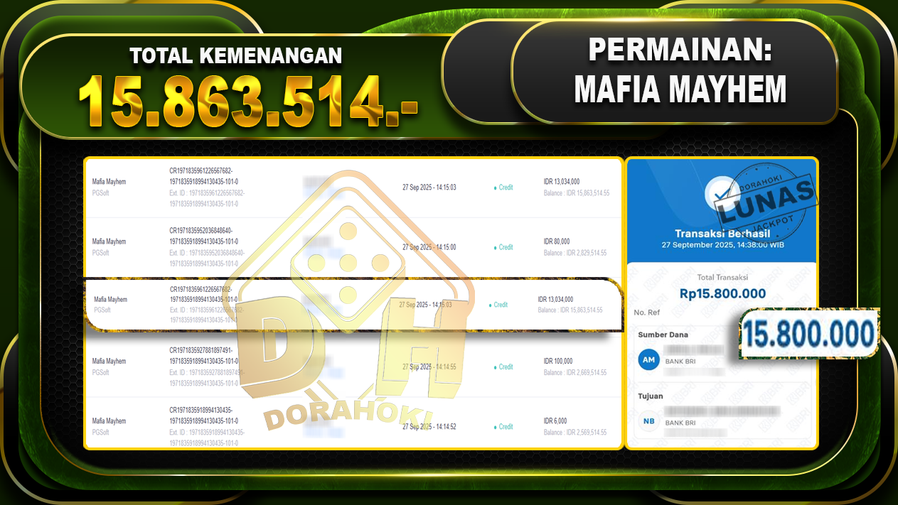 Bukti JP Mafia Mayhem – ucapkan selamat kepada user id banxxxxx atas kemenangan di Mafia Mayhem dengan total kemenangan Rp.15.863.514,- . Yang pasti nya langsung LUNAS sesuai bukti ya bosku. Dorahoki nih bosku berapapun akan tetap kami bayar lunas ya bosku.