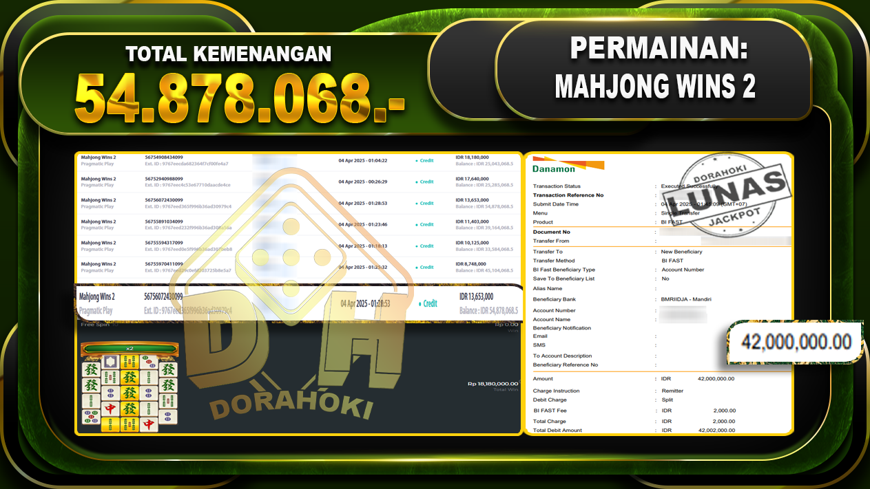 Bukti JP MAHJONG WAYS 2 – ucapkan selamat kepada user id Chaxxx atas kemenangan di MAHJONG WAYS 2 dengan total kemenangan Rp.54.878.068,- . Yang pasti nya langsung LUNAS sesuai bukti ya bosku. Dorahoki nih bosku berapapun akan tetap kami bayar lunas ya bosku.
