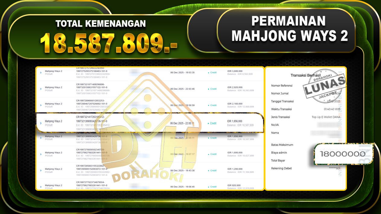 Bukti JP Mahjong Ways 2 – ucapkan selamat kepada user id cinxxx atas kemenangan di Mahjong Ways 2 dengan total kemenangan Rp.18.587.809,- Yang pasti nya langsung LUNAS sesuai bukti ya bosku. Dorahoki nih bosku berapapun akan tetap kami bayar lunas ya bosku
