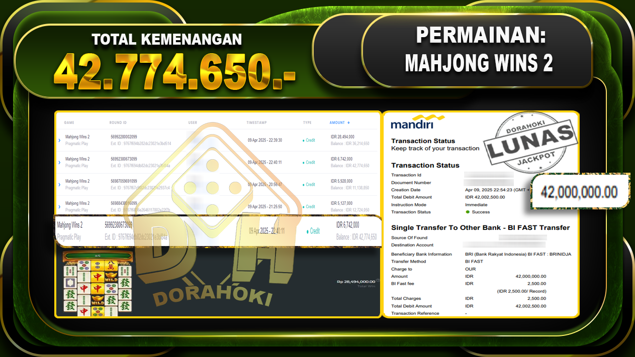 Bukti JP Mahjong Ways 2 – ucapkan selamat kepada user id Fkmxxx atas kemenangan di Mahjong Ways 2 dengan total kemenangan Rp.42.774.650,- . Yang pasti nya langsung LUNAS sesuai bukti ya bosku. Dorahoki nih bosku berapapun akan tetap kami bayar lunas ya bosku.