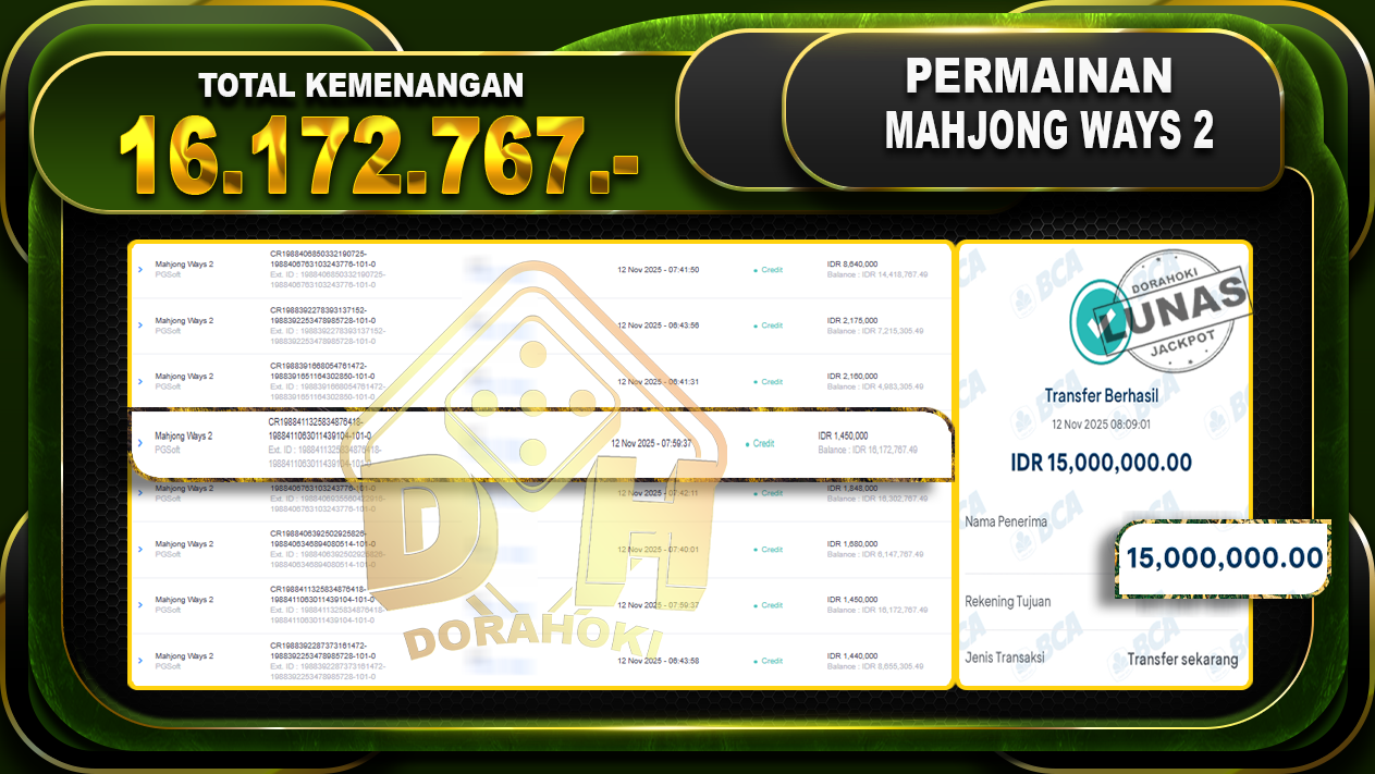 Bukti JP Mahjong Ways 2 – ucapkan selamat kepada user id Jp1x atas kemenangan di Mahjong Ways 2 dengan total kemenangan Rp.16.172.767,- Yang pasti nya langsung LUNAS sesuai bukti ya bosku. Dorahoki nih bosku berapapun akan tetap kami bayar lunas ya bosku