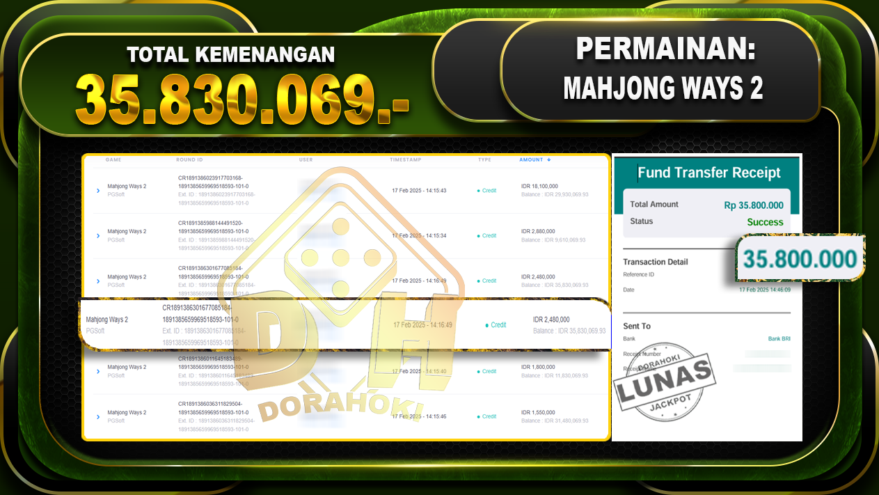 Bukti JP MAHJONG WAYS 2 – ucapkan selamat kepada user id PEPERGAM1xxx atas kemenangan di MAHJONG WAYS 2 dengan total kemenangan Rp.35.830.069,- . Yang pasti nya langsung LUNAS sesuai bukti ya bosku. Dorahoki nih bosku berapapun akan tetap kami bayar lunas ya bosku.