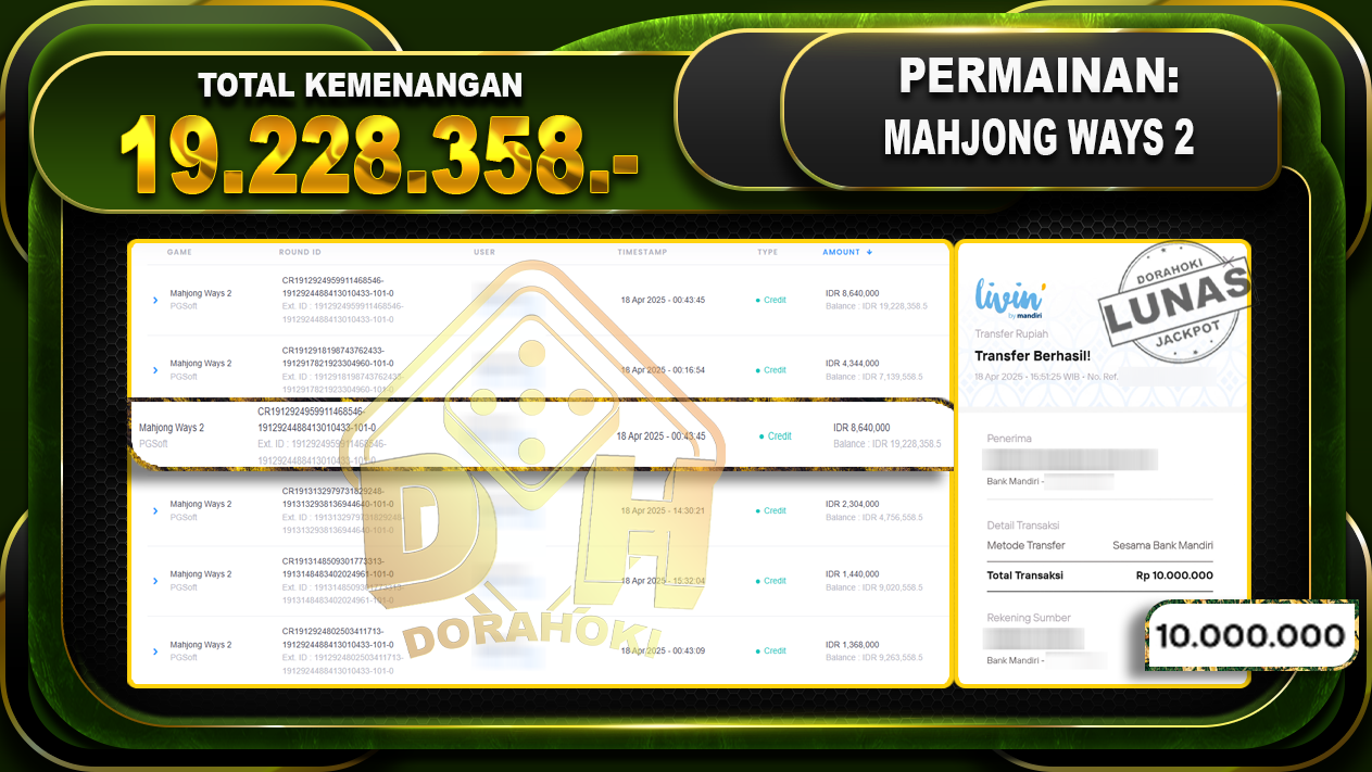 Bukti JP MAHJONG WAYS 2 – ucapkan selamat kepada user id Bagxxx atas kemenangan di MAHJONG WAYS 2 dengan total kemenangan Rp.19.228.358,- . Yang pasti nya langsung LUNAS sesuai bukti ya bosku. Dorahoki nih bosku berapapun akan tetap kami bayar lunas ya bosku.