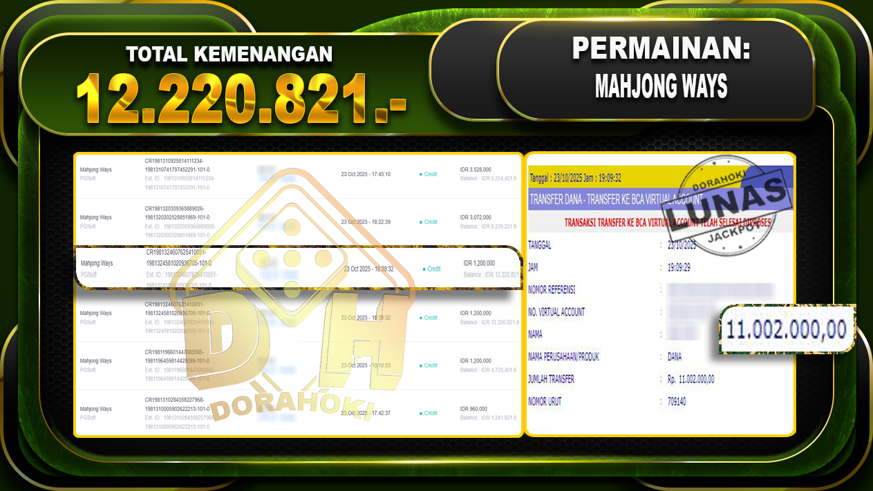 Bukti JP Mahjong Ways 2 – ucapkan selamat kepada user id dirxxxx atas kemenangan di Mahjong Ways 2 dengan total kemenangan Rp.12.220.821,- Yang pasti nya langsung LUNAS sesuai bukti ya bosku. Dorahoki nih bosku berapapun akan tetap kami bayar lunas ya bosku