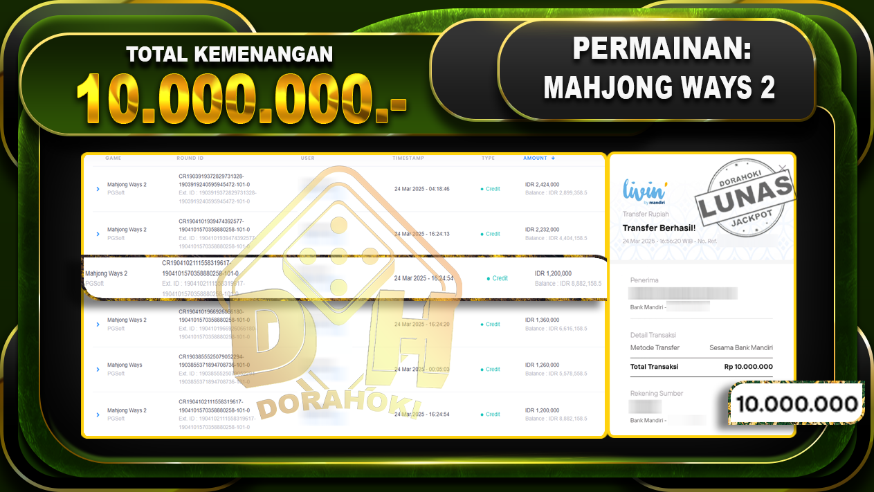 Bukti JP MAHJONG WAYS 2 – ucapkan selamat kepada user id Bagxxx atas kemenangan di MAHJONG WAYS 2 dengan total kemenangan Rp.10.000.000,- . Yang pasti nya langsung LUNAS sesuai bukti ya bosku. Dorahoki nih bosku berapapun akan tetap kami bayar lunas ya bosku.